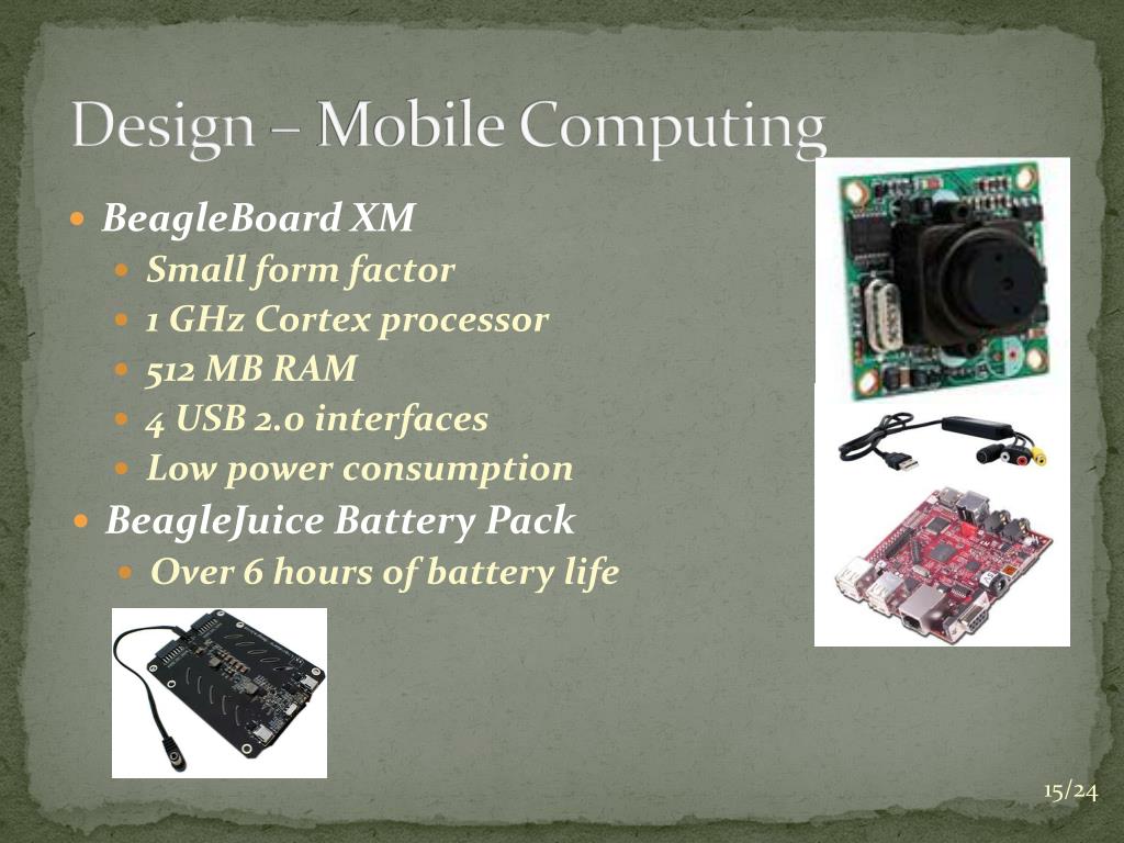 Design – Mobile Computing • BeagleBoard XM • Small form factor • 1 GHz Cortex processor • 512 MB RAM • 4 USB 2.0 interfaces • Low power consumption • BeagleJuice Battery Pack • Over 6 hours of battery life