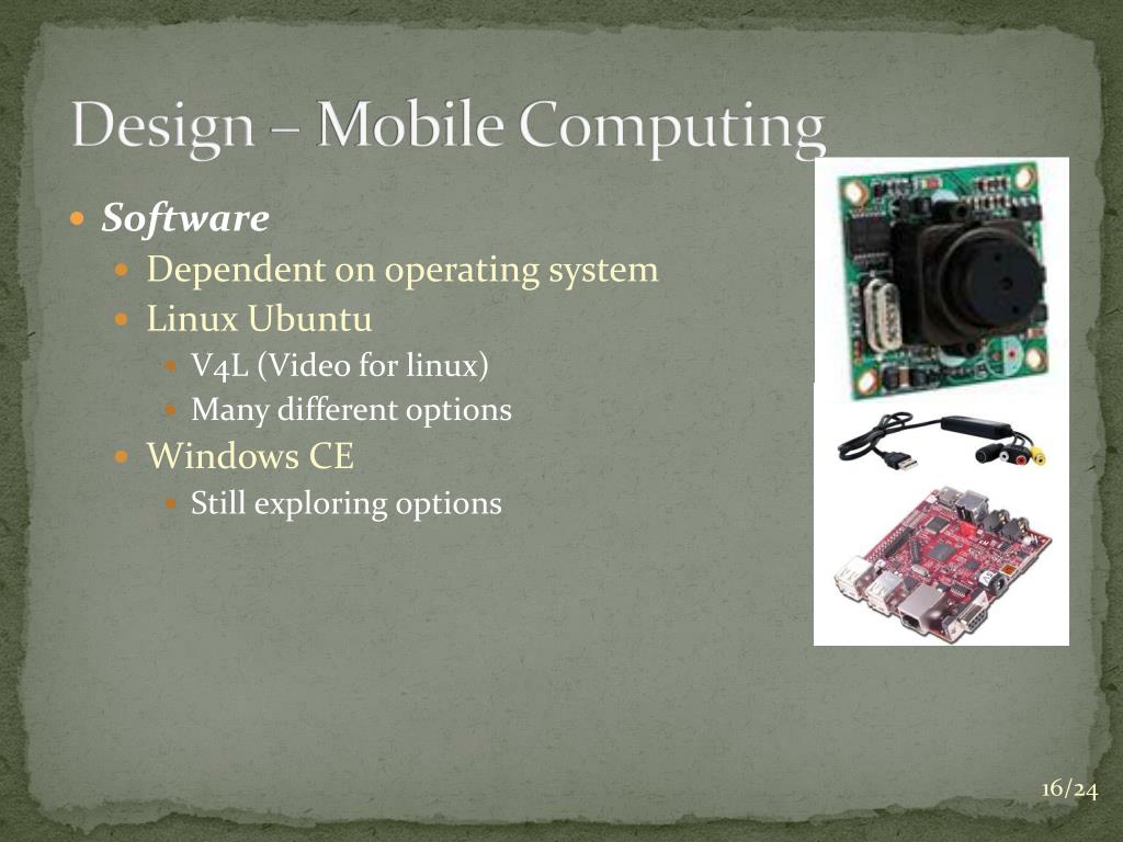 Design – Mobile Computing • Software • Dependent on operating system • Linux Ubuntu • V4L (Video for linux) • Many different options • Windows CE • Still exploring options