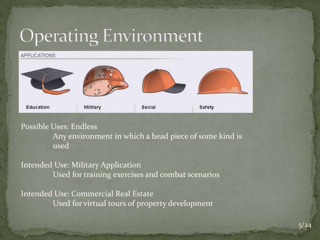 Operating Environment Possible Uses: Endless Any environment in which a head piece of some kind is used Intended Use: Military Application Used for training exercises and combat scenarios Intended Use: Commercial Real Estate Used for virtual tours of property development