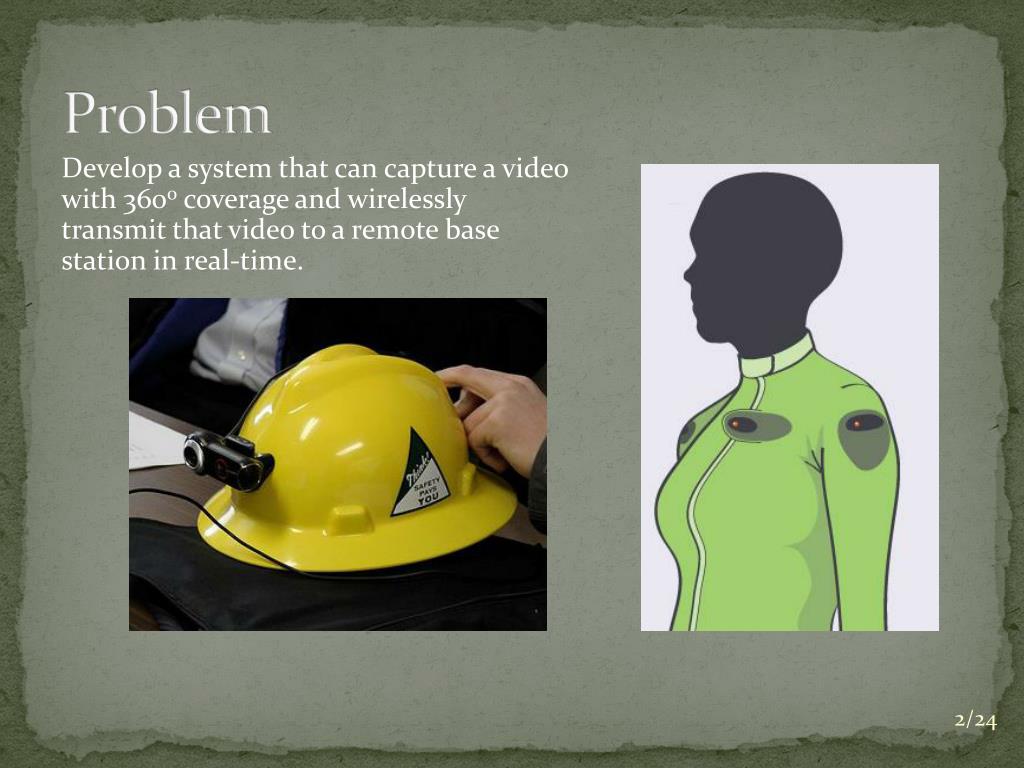 Problem Develop a system that can capture a video with 360o coverage and wirelessly transmit that video to a remote base station in real-time.