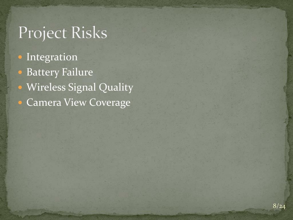 Project Risks • Integration • Battery Failure • Wireless Signal Quality • Camera View Coverage