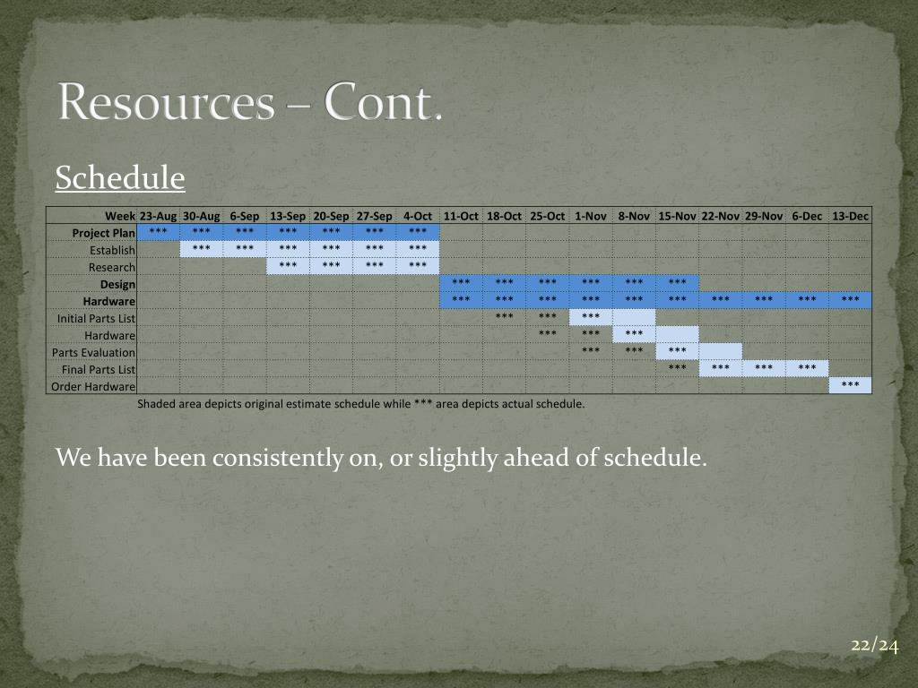 Resources – Cont. Schedule We have been consistently on, or slightly ahead of schedule.
