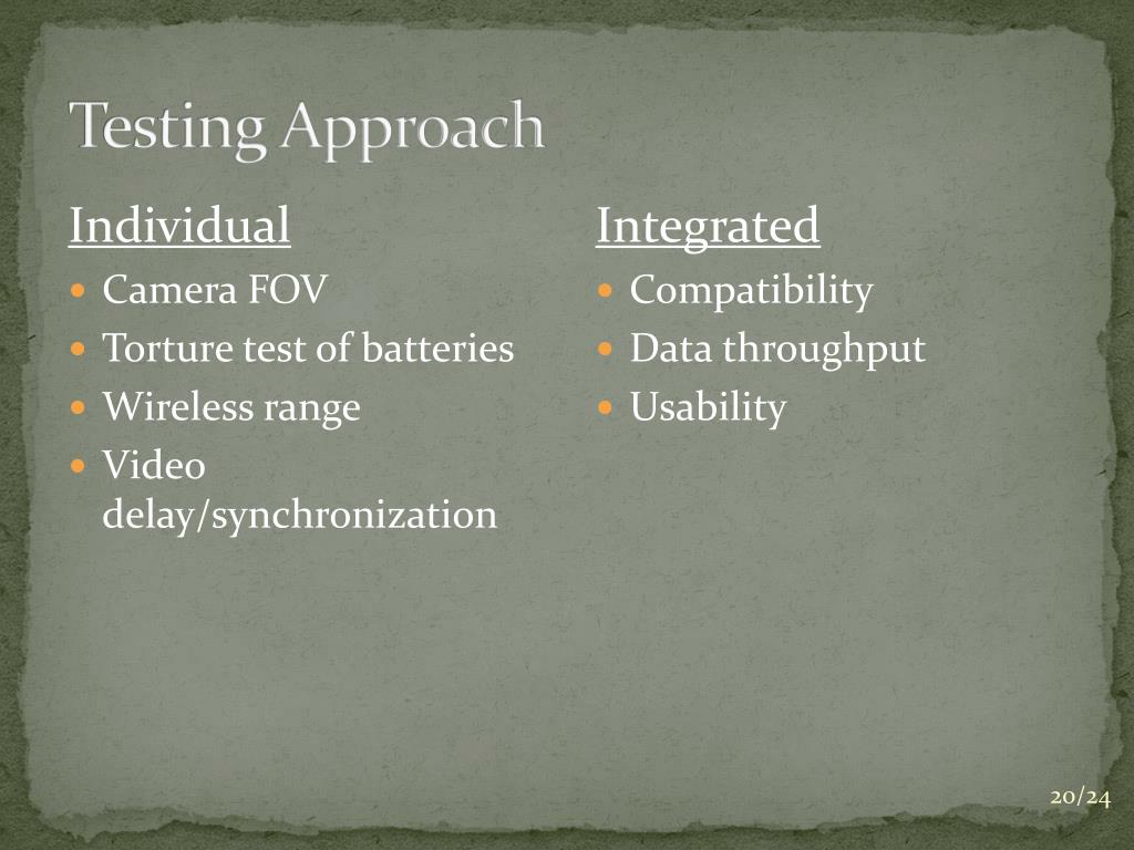 Testing Approach Individual • Camera FOV • Torture test of batteries • Wireless range • Video delay/synchronization Integrated • Compatibility • Data throughput • Usability