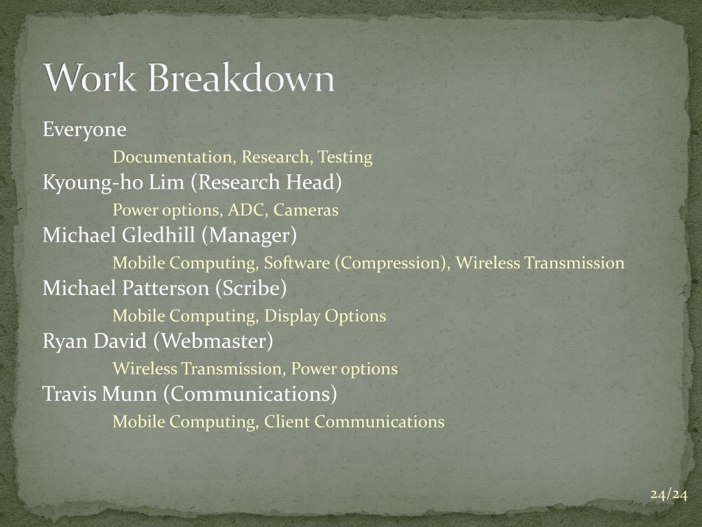Work Breakdown Everyone Documentation, Research, Testing Kyoung-ho Lim (Research Head) Power options, ADC, Cameras Michael Gledhill (Manager) Mobile Computing, Software (Compression), Wireless Transmission Michael Patterson (Scribe) Mobile Computing, Display Options Ryan David (Webmaster) Wireless Transmission, Power options Travis Munn (Communications) Mobile Computing, Client Communications