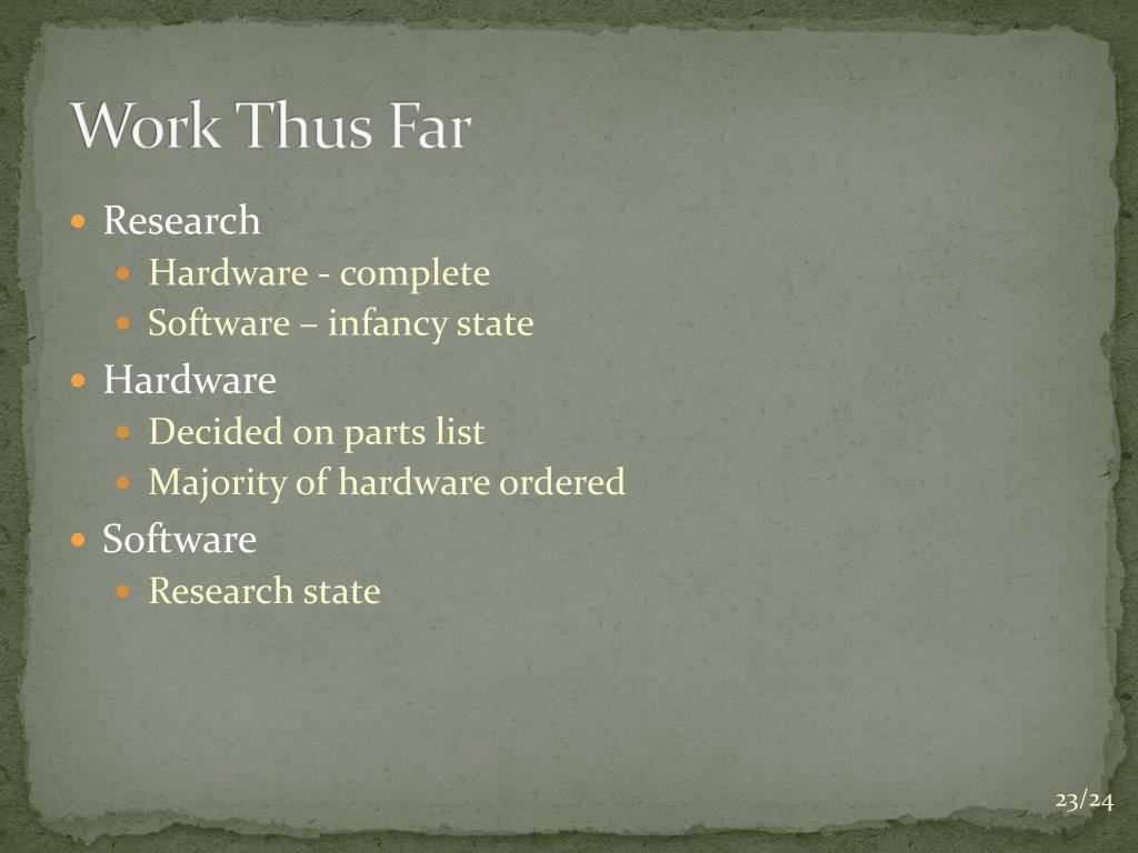 Work Thus Far • Research • Hardware - complete • Software – infancy state • Hardware • Decided on parts list • Majority of hardware ordered • Software • Research state
