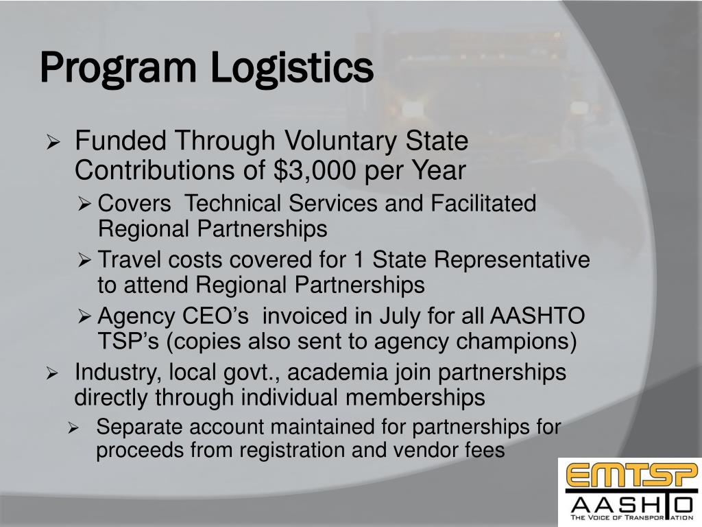 Program Logistics • Funded Through Voluntary State Contributions of $3,000 per Year • Covers Technical Services and Facilitated Regional Partnerships • Travel costs covered for 1 State Representative to attend Regional Partnerships • Agency CEO’s invoiced in July for all AASHTO TSP’s (copies also sent to agency champions) • Industry, local govt., academia join partnerships directly through individual memberships • Separate account maintained for partnerships for proceeds from registration and vendor fees