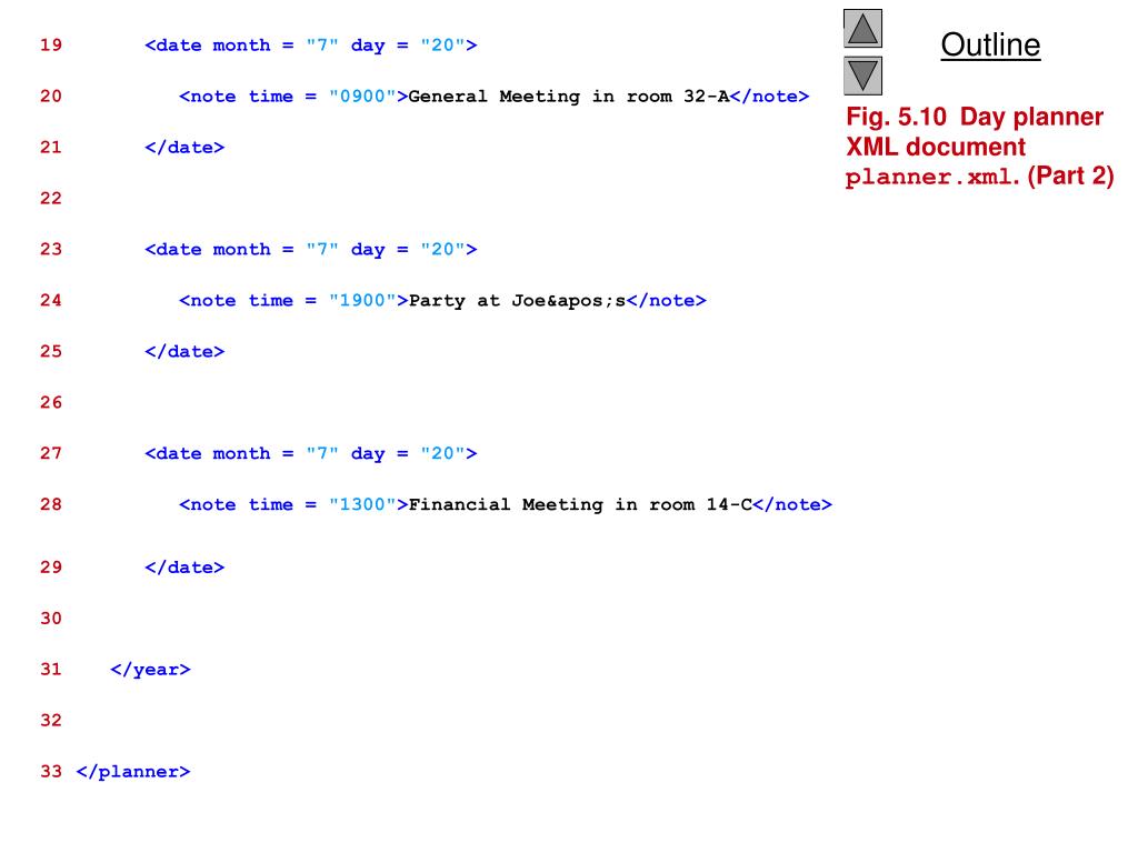 19 <date month = "7" day = "20"> 20 <note time = "0900">General Meeting in room 32-A</note> 21 </date> 22 23 <date month = "7"day = "20"> 24 <note time = "1900">Party at Joe's</note> 25 </date> 26 27 <date month = "7" day = "20"> 28 <note time = "1300">Financial Meeting in room 14-C</note> 29 </date> 30 31 </year> 32 33 </planner> Fig. 5.10 Day planner XML document planner.xml. (Part 2)