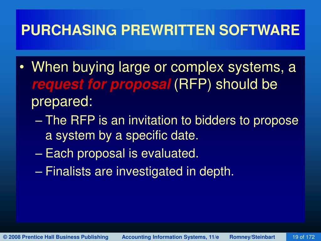 PURCHASING PREWRITTEN SOFTWARE • When buying large or complex systems, a request for proposal (RFP) should be prepared: • The RFP is an invitation to bidders to propose a system by a specific date. • Each proposal is evaluated. • Finalists are investigated in depth.