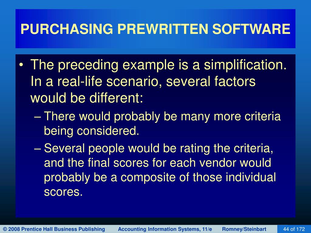 PURCHASING PREWRITTEN SOFTWARE • The preceding example is a simplification. In a real-life scenario, several factors would be different: • There would probably be many more criteria being considered. • Several people would be rating the criteria, and the final scores for each vendor would probably be a composite of those individual scores.