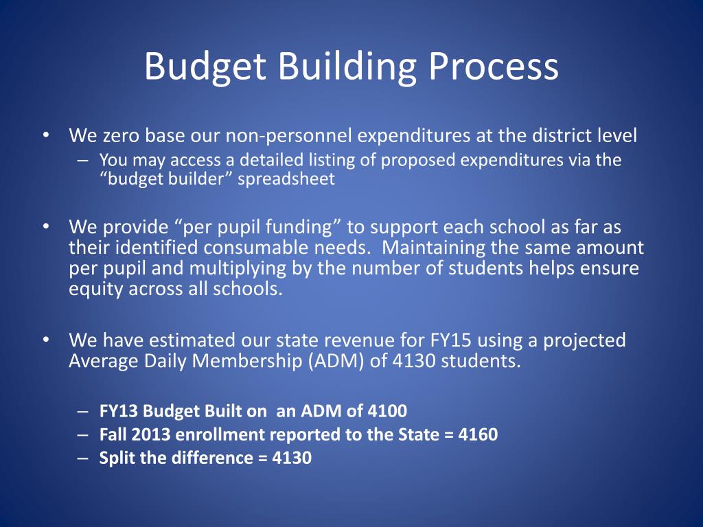 Budget Building Process • We zero base our non-personnel expenditures at the district level • You may access a detailed listing of proposed expenditures via the “budget builder” spreadsheet • We provide “per pupil funding” to support each school as far as their identified consumable needs. Maintaining the same amount per pupil and multiplying by the number of students helps ensureequity across all schools. • We have estimated our state revenue for FY15 using a projected Average Daily Membership (ADM) of 4130 students. • FY13 Budget Built on an ADM of 4100 • Fall 2013 enrollmentreported to the State = 4160 • Split the difference = 4130