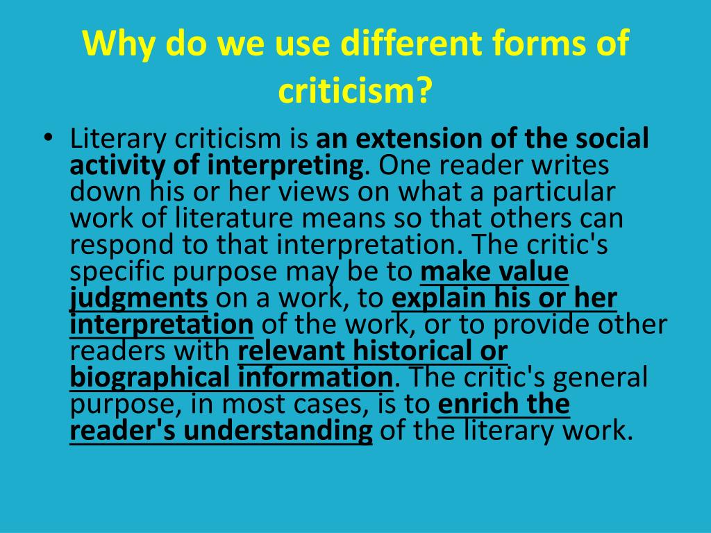 Why do we use different forms of criticism? • Literary criticism is an extension of the social activity of interpreting. One reader writes down his or her views on what a particular work of literature means so that others can respond to that interpretation. The critic's specific purpose may be to make value judgments on a work, to explain his or her interpretation of the work, or to provide other readers with relevant historical or biographical information. The critic's general purpose, in most cases, is to enrich the reader's understanding of the literary work.