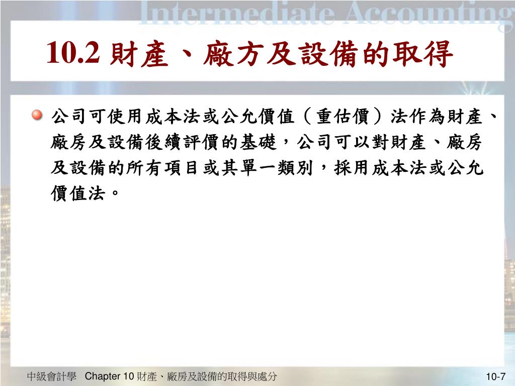 10.2 財產、廠方及設備的取得 • 公司可使用成本法或公允價值(重估價)法作為財產、廠房及設備後續評價的基礎,公司可以對財產、廠房及設備的所有項目或其單一類別,採用成本法或公允價值法。