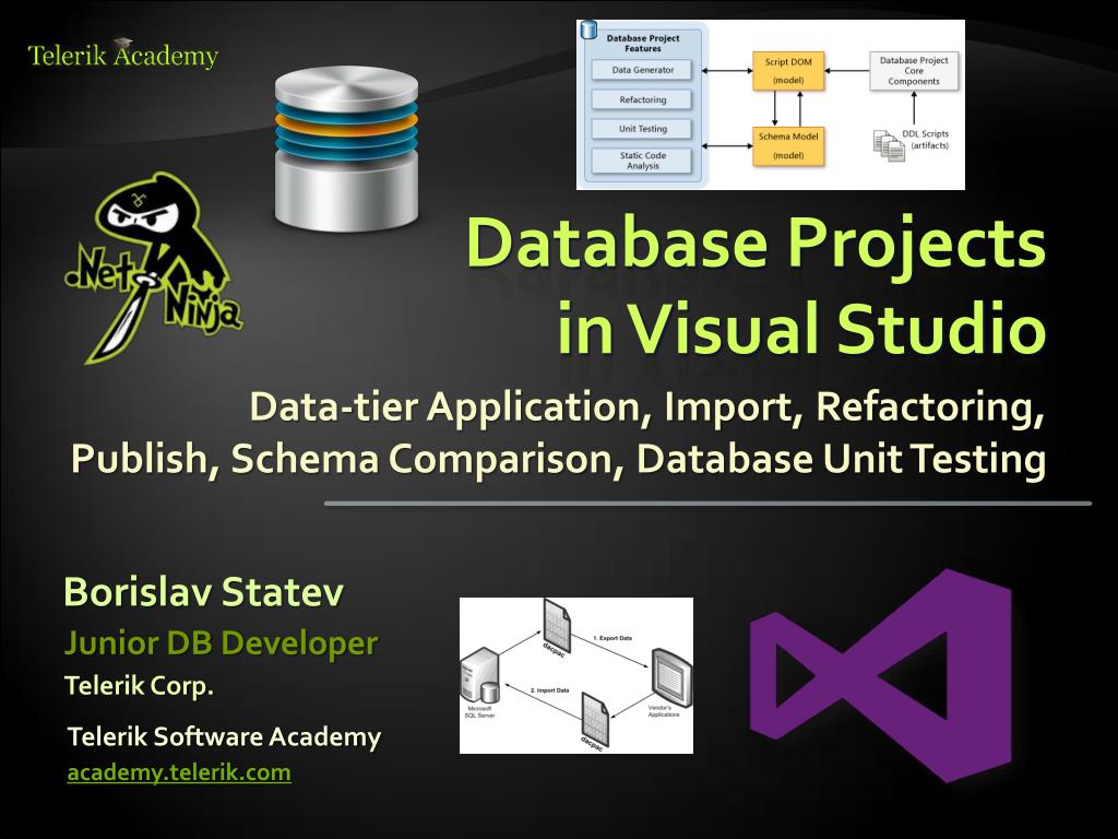 Database Projects in Visual Studio. Data-tier Application, Import, Refactoring , Publish , Schema Comparison, Database Unit Testing . Borislav Statev. Telerik Software Academy. academy.telerik.com. Junior DB Developer. Telerik Corp. Data-tier Application Why use a Database P roject