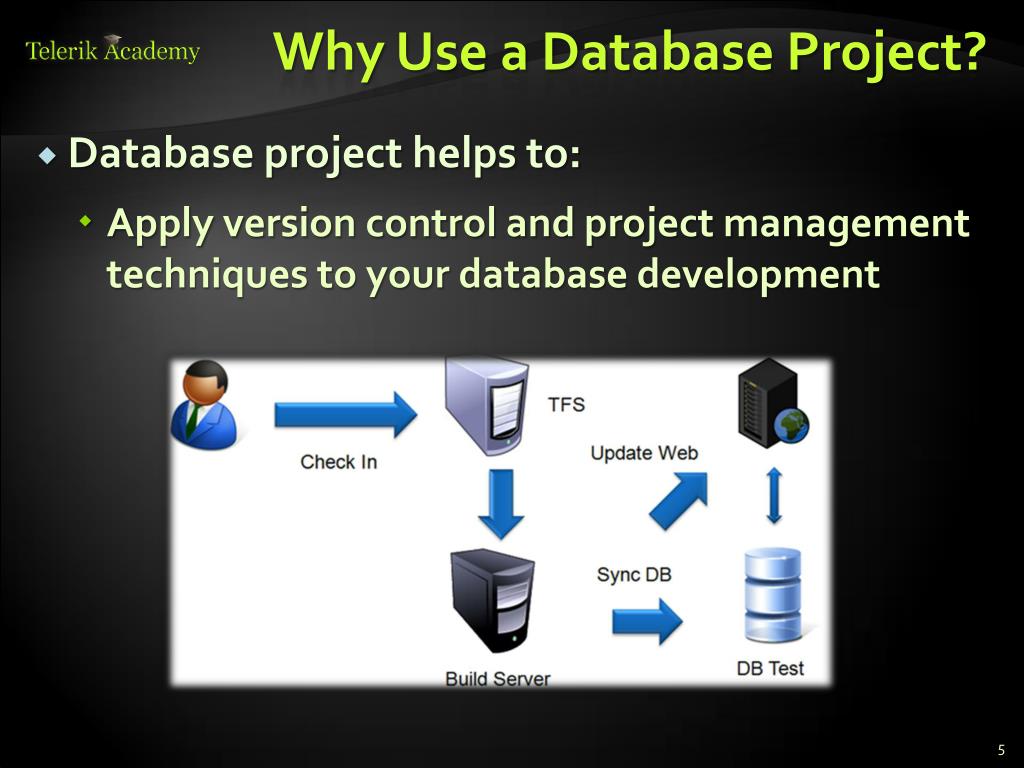 Why Use a Database Project? • Database project helps to: • Apply version control and project management techniques to your database development