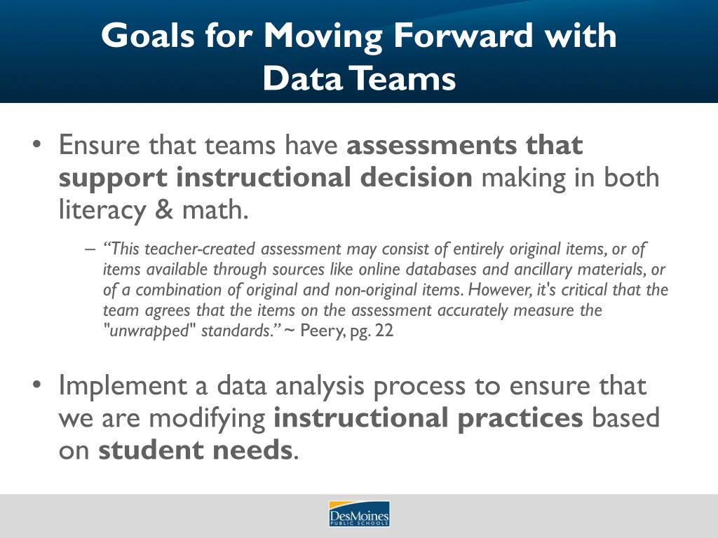 Goals for Moving Forward with Data Teams • Ensure that teams have assessments that support instructional decision making in both literacy & math. • “This teacher-created assessment may consist of entirely original items, or of items available through sources like online databases and ancillary materials, or of a combination of original and non-original items. However, it's critical that the team agrees that the items on the assessment accurately measure the "unwrapped" standards.” ~ Peery, pg. 22 • Implement a data analysis process to ensure that we are modifying instructional practices based on student needs.