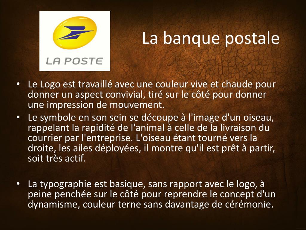La banque postale • Le Logo est travaillé avec une couleur vive et chaude pour donner un aspect convivial, tiré sur le côté pour donner une impression de mouvement. • Le symbole en son sein se découpe à l'image d'un oiseau, rappelant la rapidité de l'animal à celle de la livraison du courrier par l'entreprise. L'oiseau étant tourné vers la droite, les ailes déployées, il montre qu'il est prêt à partir, soit très actif. • La typographie est basique, sans rapport avec le logo, à peine penchée sur le côté pour reprendre le concept d'un dynamisme, couleur terne sans davantage de cérémonie.