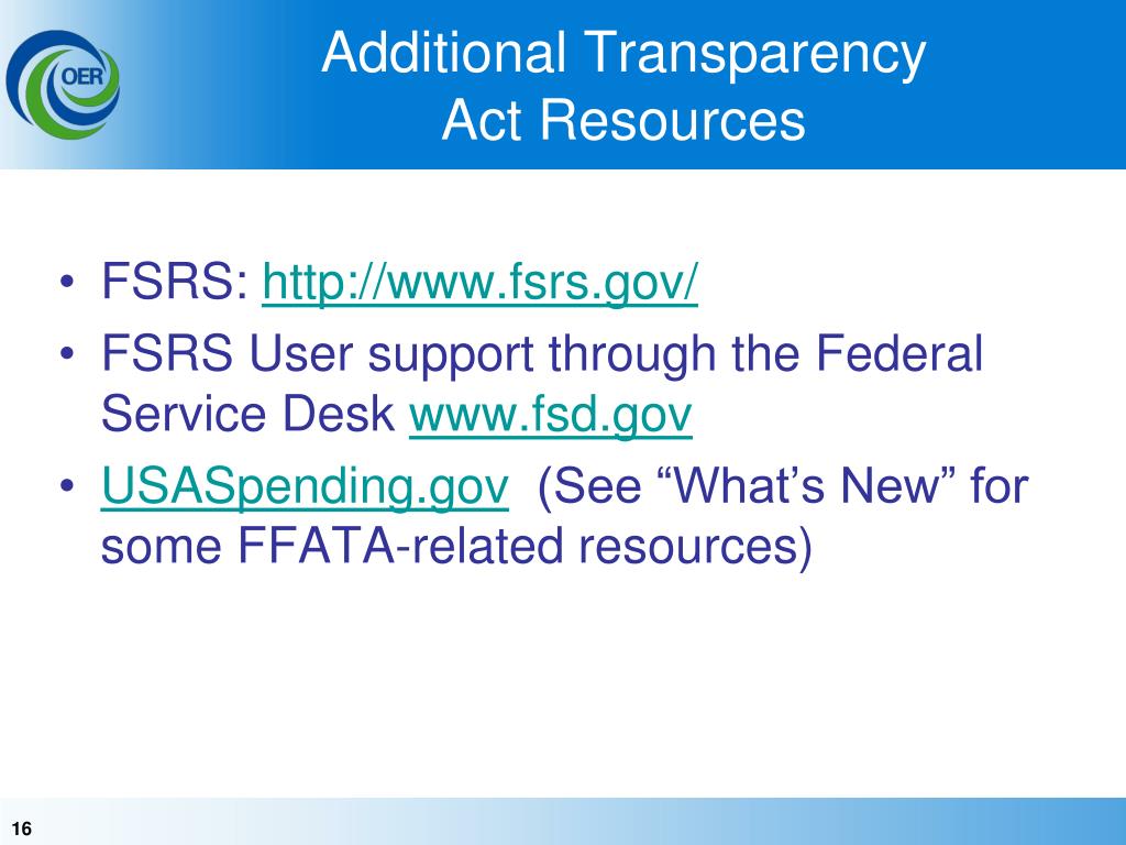 Additional TransparencyAct Resources FSRS: http://www.fsrs.gov/ FSRS User support through the Federal Service Desk www.fsd.gov USASpending.gov (See “What’s New” for some FFATA-related resources)