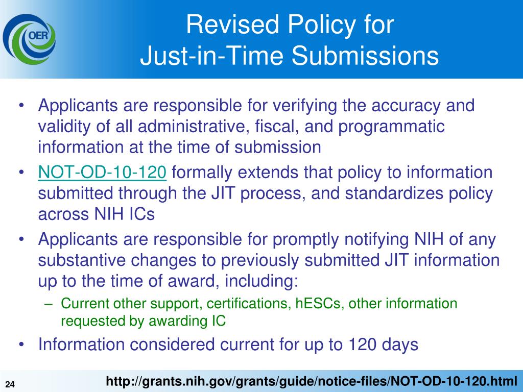 Revised Policy for Just-in-Time Submissions • Applicants are responsible for verifying the accuracy and validity of all administrative, fiscal, and programmatic information at the time of submission • NOT-OD-10-120 formally extends that policy to information submitted through the JIT process, and standardizes policy across NIH ICs • Applicants are responsible for promptly notifying NIH of any substantive changes to previously submitted JIT information up to the time of award, including: • Current other support, certifications, hESCs, other information requested by awarding IC • Information considered current for up to 120 days http://grants.nih.gov/grants/guide/notice-files/NOT-OD-10-120.html