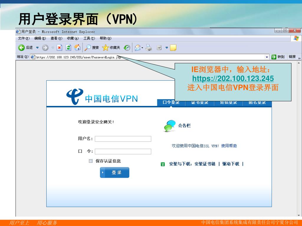 用户登录界面(VPN) IE浏览器中,输入地址:https://202.100.123.245 进入中国电信VPN登录界面