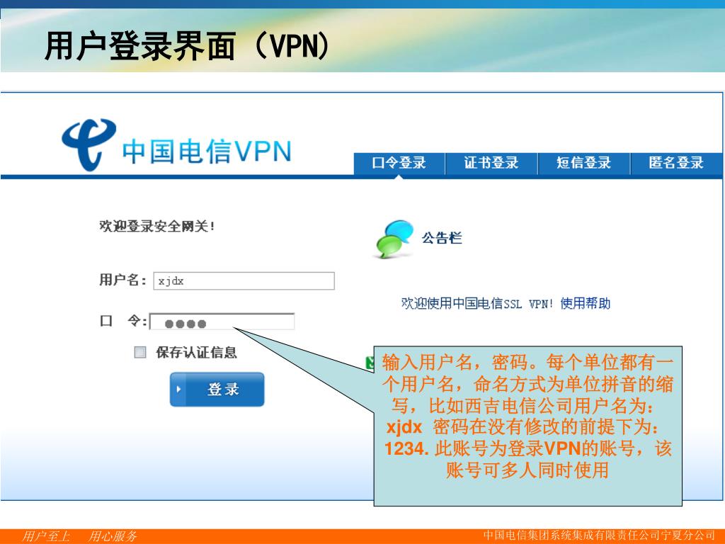 用户登录界面(VPN) 输入用户名,密码。每个单位都有一个用户名,命名方式为单位拼音的缩写,比如西吉电信公司用户名为:xjdx 密码在没有修改的前提下为:1234. 此账号为登录VPN的账号,该账号可多人同时使用