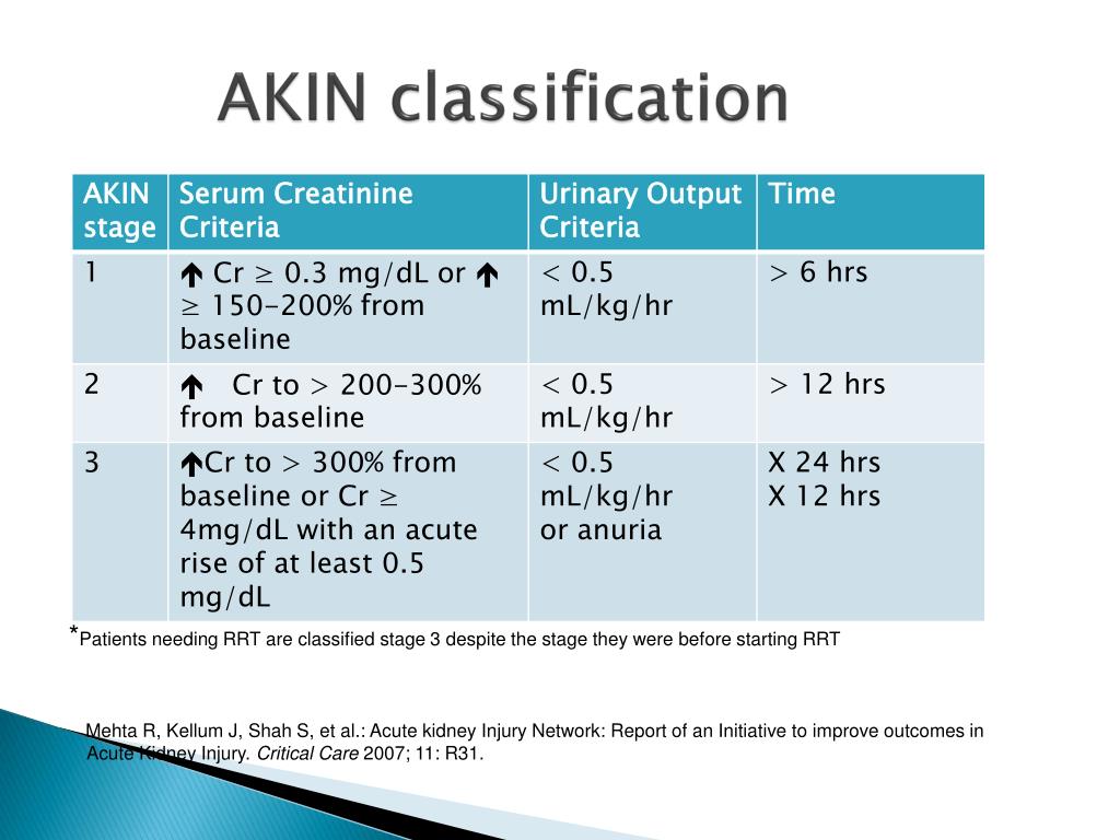 AKIN classification *Patients needing RRT are classified stage 3 despite the stage they were before starting RRT Mehta R, Kellum J, Shah S, et al.: Acute kidney Injury Network: Report of an Initiative to improve outcomes in Acute Kidney Injury. Critical Care 2007; 11: R31.