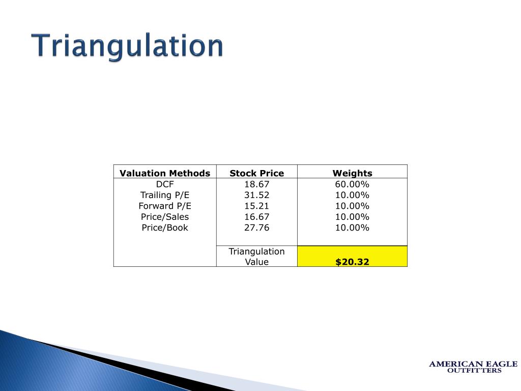 Recommendation • Hold current position – 2,500 shares • DCF values AEO between $17 - $20 • AEO currently trading at $17.66 • (Within the range of DCF on low end) • Multiples analysis puts AEO between $15-$30 • AEO already ~ 14.3% of portfolio • Remains a strong company with a light debt load and an ability to generate ample cash flows.