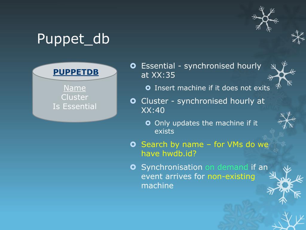 Puppet_db • Essential - synchronised hourly at XX:35 • Insert machine if it does not exits • Cluster - synchronised hourly at XX:40 • Only updates the machine if it exists • Search by name – for VMs do we have hwdb.id? • Synchronisation on demand if an event arrives for non-existing machine Name Cluster Is Essential LANDB PUPPETDB