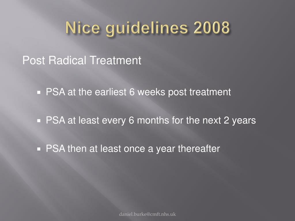 Nice guidelines 2008 Post Radical Treatment • PSA at the earliest 6 weeks post treatment • PSA at least every 6 months for the next 2 years • PSA then at least once a year thereafter daniel.burke@cmft.nhs.uk