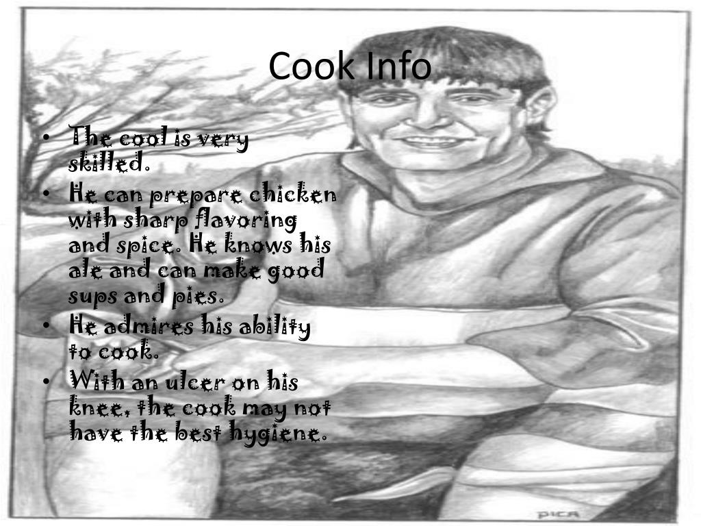 Cook Info • The cool is very skilled. • He can prepare chicken with sharp flavoring and spice. He knows his ale and can make good sups and pies. • He admires his ability to cook. • With an ulcer on his knee, the cook may not have the best hygiene.
