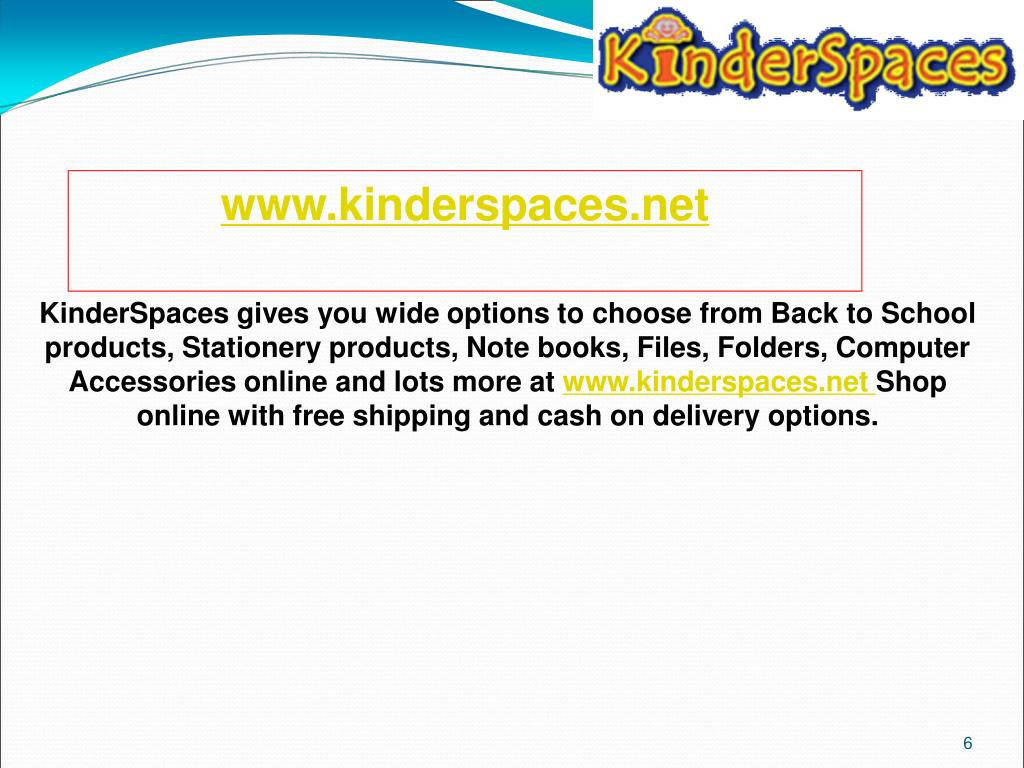 www.kinderspaces.net KinderSpaces gives you wide options to choose from Back to School products, Stationery products, Note books, Files, Folders, Computer Accessories online and lots more at www.kinderspaces.netShop online with free shipping and cash on delivery options.