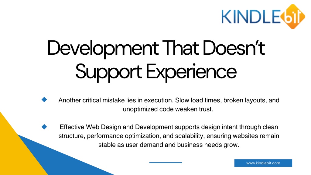 5. Development That Doesn’t Support Experience Another critical mistake lies in execution. Slow load times, broken layouts, and unoptimized code weaken trust. Effective Web Design and Development supports design intent through clean structure, performance optimization, and scalability, ensuring websites remain stable as user demand and business needs grow. www.kindlebit.com