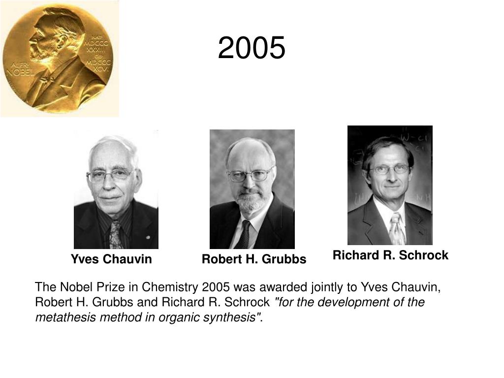 2005 Richard R. Schrock Yves Chauvin Robert H. Grubbs The Nobel Prize in Chemistry 2005 was awarded jointly to Yves Chauvin, Robert H. Grubbs and Richard R. Schrock "for the development of the metathesis method in organic synthesis".