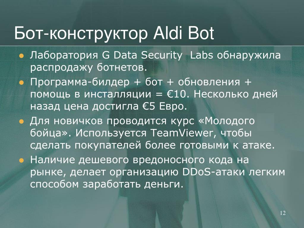 Бот-конструктор AldiBot • Лаборатория G DataSecurityLabs обнаружила распродажу ботнетов. • Программа-билдер+ бот + обновления + помощь в инсталляции = €10. Несколько дней назад цена достигла €5 Евро. • Для новичков проводится курс «Молодого бойца». Используется TeamViewer, чтобы сделать покупателей более готовыми к атаке. • Наличие дешевого вредоносного кода на рынке, делает организацию DDoS-атаки легким способом заработать деньги.