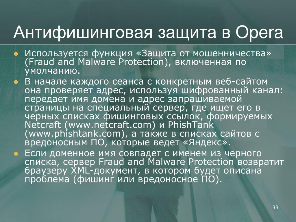 Антифишинговая защита в Opera • Используется функция «Защита от мошенничества» (FraudandMalwareProtection), включенная по умолчанию. • В начале каждого сеанса с конкретным веб-сайтом она проверяет адрес, используя шифрованный канал: передает имя домена и адрес запрашиваемой страницы на специальный сервер, где ищет его в черных списках фишинговых ссылок, формируемых Netcraft (www.netcraft.com) и PhishTank (www.phishtank.com), а также в списках сайтов с вредоносным ПО, которые ведет «Яндекс». • Если доменное имя совпадет с именем из черного списка, сервер FraudandMalwareProtection возвратит браузеру XML-документ, в котором будет описана проблема (фишинг или вредоносное ПО).