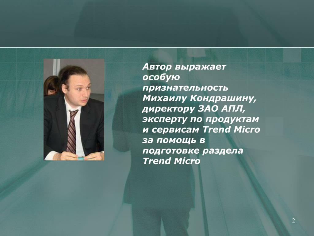 Автор выражает особую признательность Михаилу Кондрашину, директору ЗАО АПЛ, эксперту по продуктам и сервисам TrendMicro за помощь в подготовке раздела Trend Micro