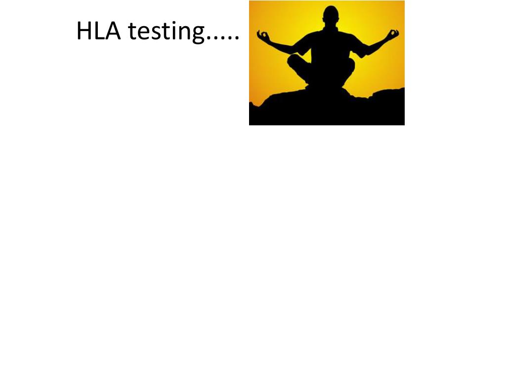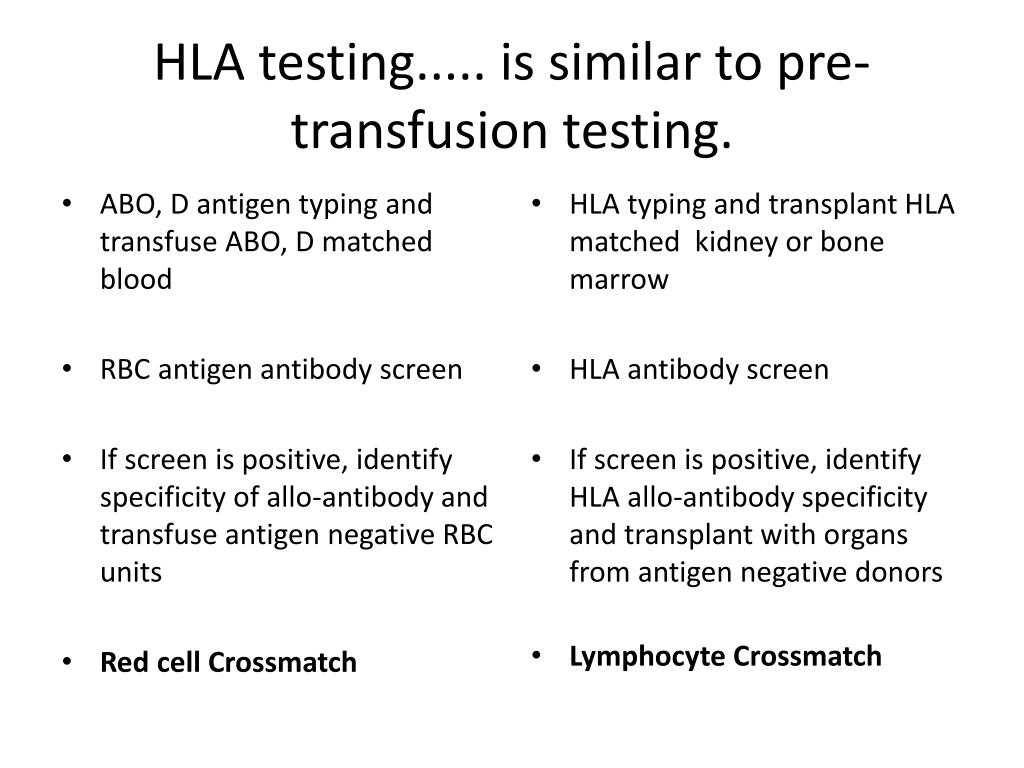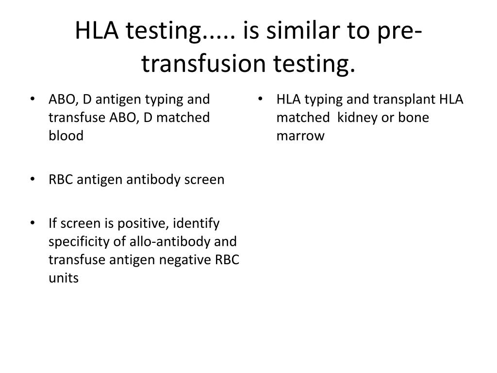 HLA testing..... is similar to pre-transfusion testing. • ABO, D antigen typing and transfuse ABO, D matched blood • HLA typing and transplant HLA matched kidney or bone marrow