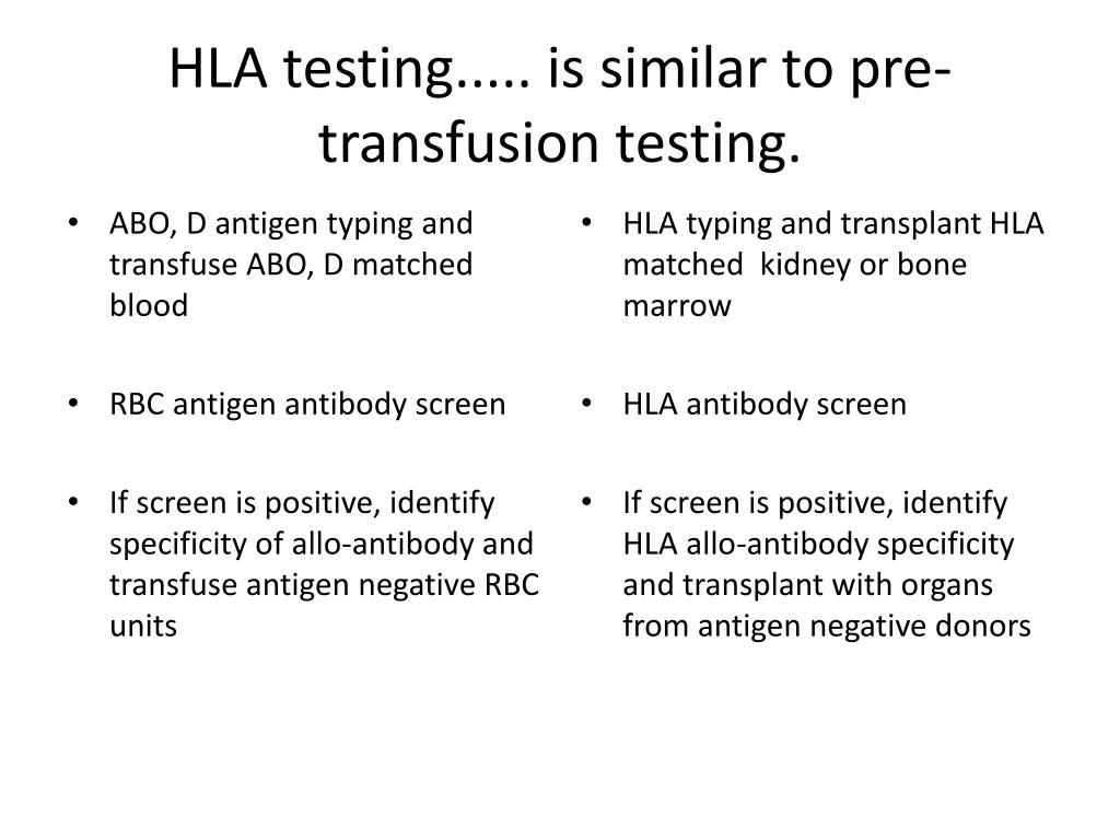 HLA testing..... is similar to pre-transfusion testing. • ABO, D antigen typing and transfuse ABO, D matched blood • RBC antigen antibody screen • If screen is positive, identify specificity of allo-antibody and transfuse antigen negative RBC units • HLA typing and transplant HLA matched kidney or bone marrow • HLA antibody screen • If screen is positive, identify HLA allo-antibody specificity and transplant with organs from antigen negative donors