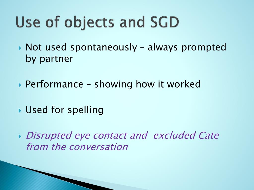 Use of objects and SGD • Not used spontaneously – always prompted by partner • Performance – showing how it worked • Used for spelling • Disrupted eye contact and excluded Cate from the conversation