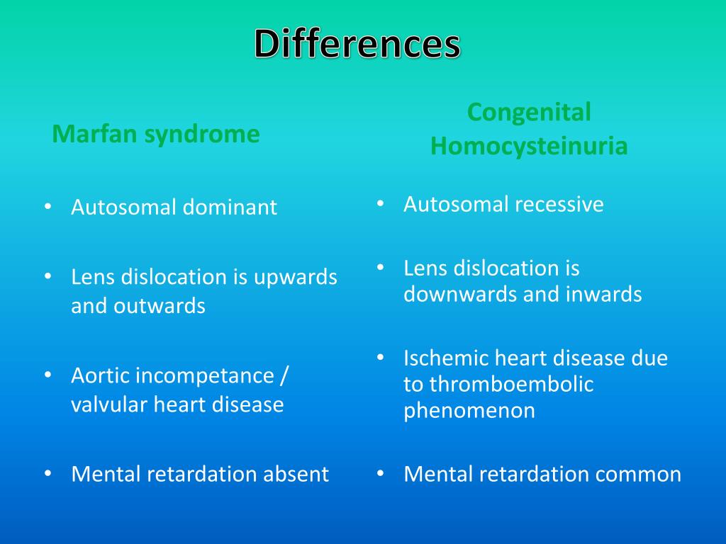 Differences Marfan syndrome Congenital Homocysteinuria Autosomal recessive Lens dislocation is downwards and inwards Ischemic heart disease due to thromboembolic phenomenon Mental retardation common • Autosomal dominant • Lens dislocation is upwards and outwards • Aortic incompetance / valvular heart disease • Mental retardation absent