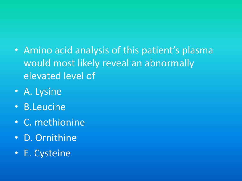 Amino acid analysis of this patient’s plasma would most likely reveal an abnormally elevated level of • A. Lysine • B.Leucine • C. methionine • D. Ornithine • E. Cysteine