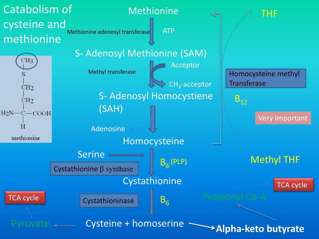 Catabolism of cysteine and methionine Methionine THF ATP Methionineadenosyltransferase S- Adenosyl Methionine (SAM) Acceptor CH3-acceptor Methyl transferase Homocysteine methyl Transferase S- Adenosyl Homocystiene (SAH) B12 Very Important Adenosine Homocysteine Serine Methyl THF B6 (PLP) Cystathionineβsynthase Cystathionine TCA cycle Propionyl Co-A TCA cycle B6 Cystathioninase Pyruvate Cysteine + homoserine Alpha-keto butyrate