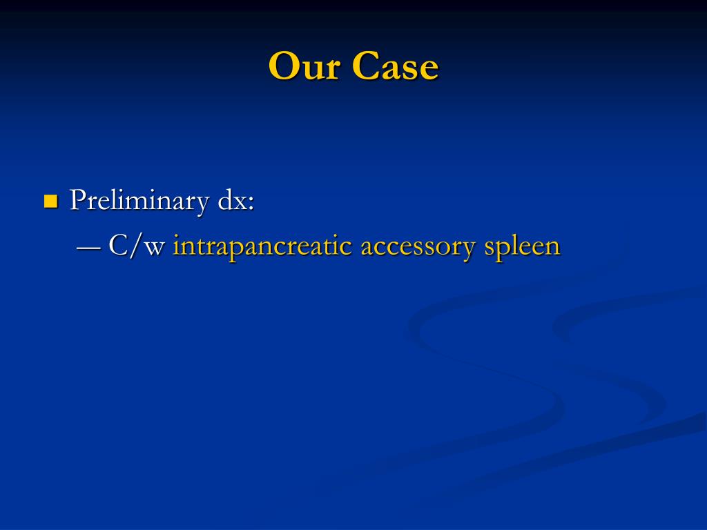 Our Case • Preliminary dx: ― C/w intrapancreatic accessory spleen