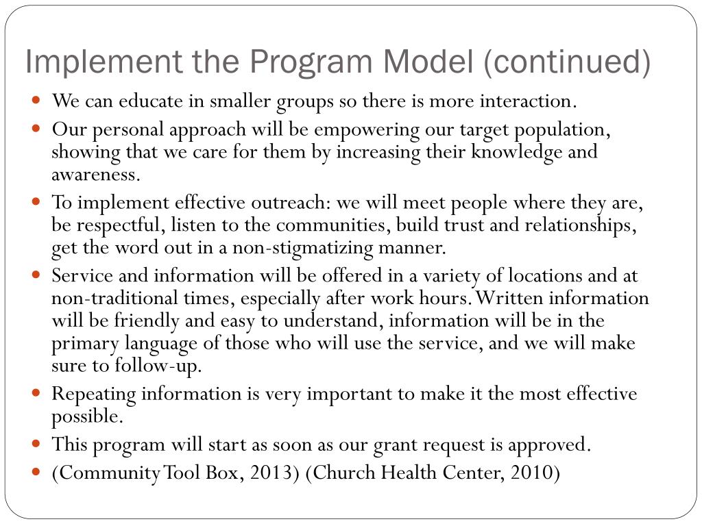 Implement the Program Model (continued) • We can educate in smaller groups so there is more interaction. • Our personal approach will be empowering our target population, showing that we care for them by increasing their knowledge and awareness. • To implement effective outreach: we will meet people where they are, be respectful, listen to the communities, build trust and relationships, get the word out in a non-stigmatizing manner. • Service and information will be offered in a variety of locations and at non-traditional times, especially after work hours. Written information will be friendly and easy to understand, information will be in the primary language of those who will use the service, and we will make sure to follow-up. • Repeating information is very important to make it the most effective possible. • This program will start as soon as our grant request is approved. • (Community Tool Box, 2013) (Church Health Center, 2010)