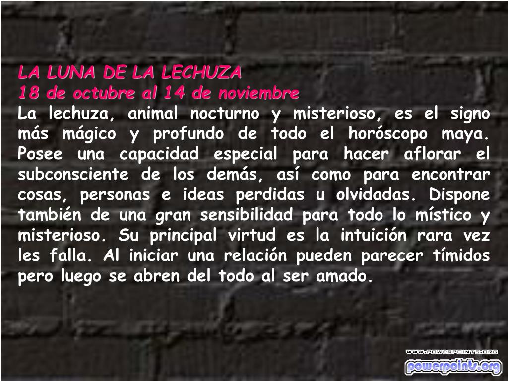 LA LUNA DE LA LECHUZA 18 de octubre al 14 de noviembre La lechuza, animal nocturno y misterioso, es el signo más mágico y profundo de todo el horóscopo maya. Posee una capacidad especial para hacer aflorar el subconsciente de los demás, así como para encontrar cosas, personas e ideas perdidas u olvidadas. Dispone también de una gran sensibilidad para todo lo místico y misterioso. Su principal virtud es la intuición rara vez les falla. Al iniciar una relación pueden parecer tímidos pero luego se abren del todo al ser amado.