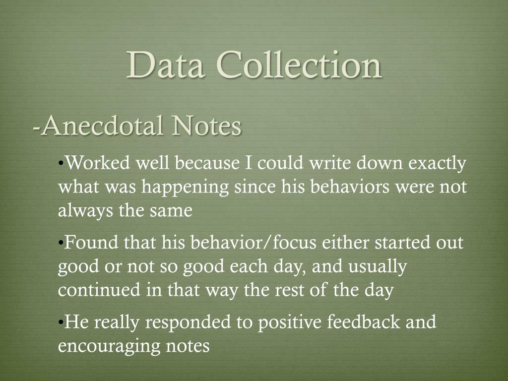 Data Collection -Anecdotal Notes Worked well because I could write down exactly what was happening since his behaviors were not always the same Found that his behavior/focus either started out good or not so good each day, and usually continued in that way the rest of the day He really responded to positive feedback and encouraging notes