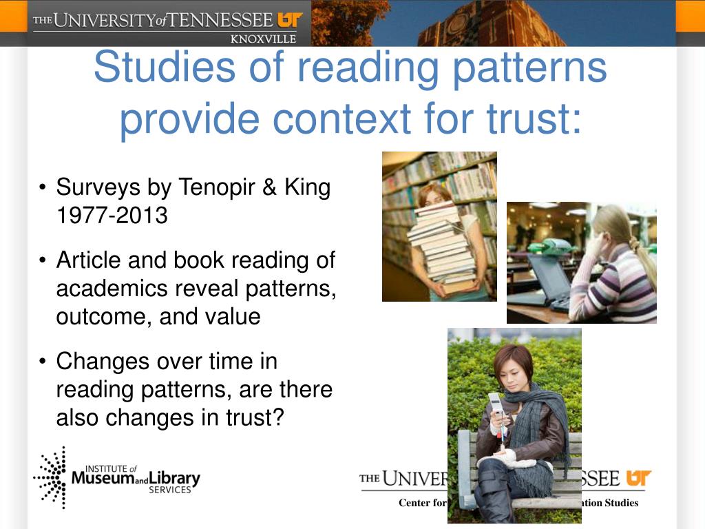 Studies of reading patterns provide context for trust: • Surveys by Tenopir & King 1977-2013 • Article and book reading of academics reveal patterns, outcome, and value • Changes over time in reading patterns, are there also changes in trust?