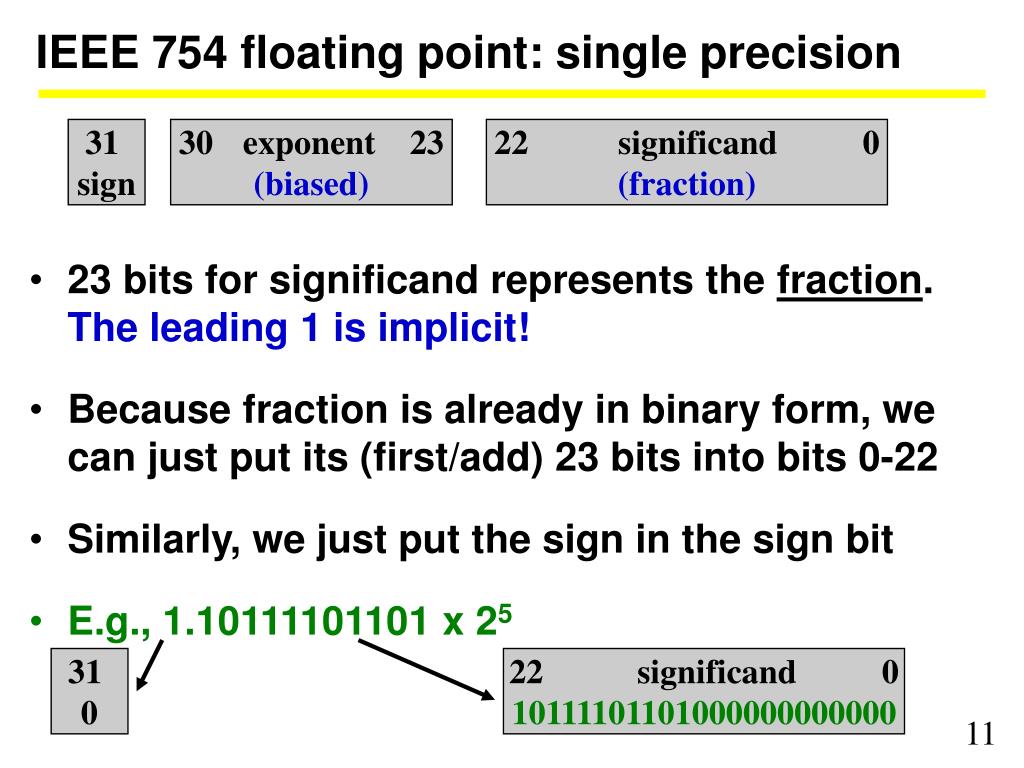 IEEE 754 floating point: single precision 31 sign • exponent 23 • (biased) • significand 0 • (fraction) • So biased exponent represents sign and magnitude of exponent in 8 bits. • Note range and reserved biased exponents (see PH3 pg 194):