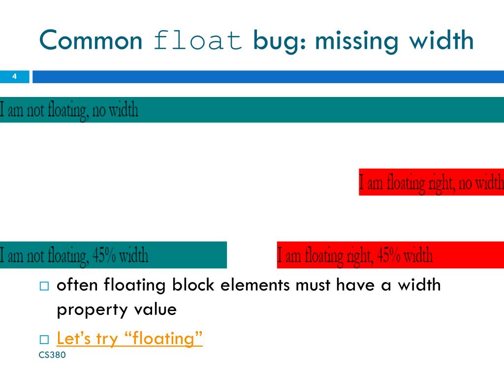 Common float bug: missing width • often floating block elements must have a width property value • Let’s try “floating” CS380