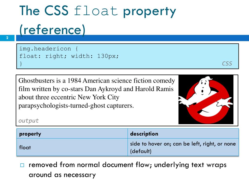 The CSS float property (reference) img.headericon { float: right; width: 130px; } CSS • removed from normal document flow; underlying text wraps around as necessary Ghostbusters is a 1984 American science fiction comedy film written by co-stars Dan Aykroyd and Harold Ramis about three eccentric New York City parapsychologists-turned-ghost capturers. output