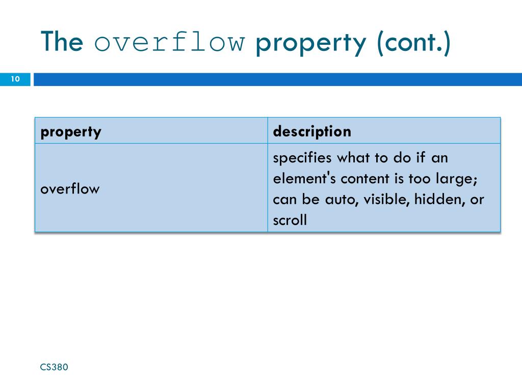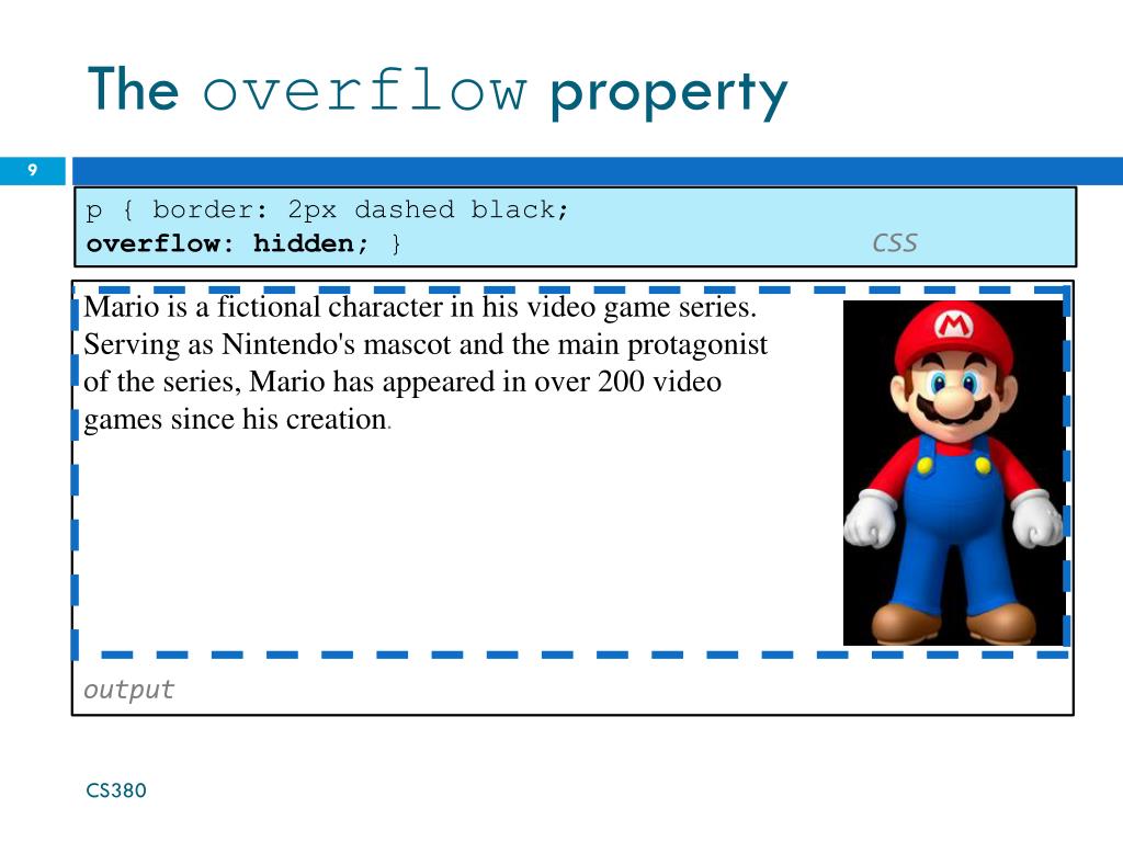 The overflow property p { border: 2px dashed black; overflow: hidden; } CSS Mario is a fictional character in his video game series. Serving as Nintendo's mascot and the main protagonist of the series, Mario has appeared in over 200 video games since his creation. output CS380